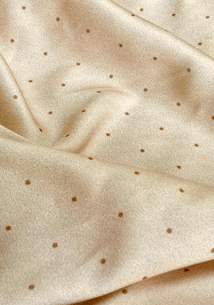 This enchanting piece cascades down to a chic midi length, adorned with playful polka dots in a luxurious champagne color. Capture the essence of romantic Coquette style with a silhouette that flatters and flows. A daring side slit adds a touch of modern allure, echoing the playful spirit of the Chloe. Adjustable black tie straps retain the whimsical charm, while meticulous craftsmanship from eco-conscious recycled polyester with a satin finish ensures sustainable luxury. Ideal for cocktail gatherings, holiday parties or captivating brunch dates.